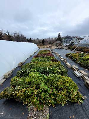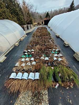 We have removed the overwintering covers from all the plants. They made it through the winter in good shape and with no vole damage. Hooray. We are always open by chance or appointment and You’re always welcome to call or text . Contact us here.